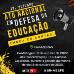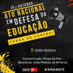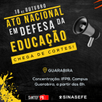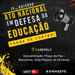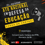 Por isso, no dia 18 de Outubro, nós, enquanto SINTEFPB, iremos às ruas junto com as(os) nossas(os) estudantes do Instituto Federal da Paraíba, assim como as(os) trabalhadores e estudantes das Universidades Federais, para construir o Dia Nacional de Luta Contra os Cortes na Educação, a ocorrer em todo o Brasil.