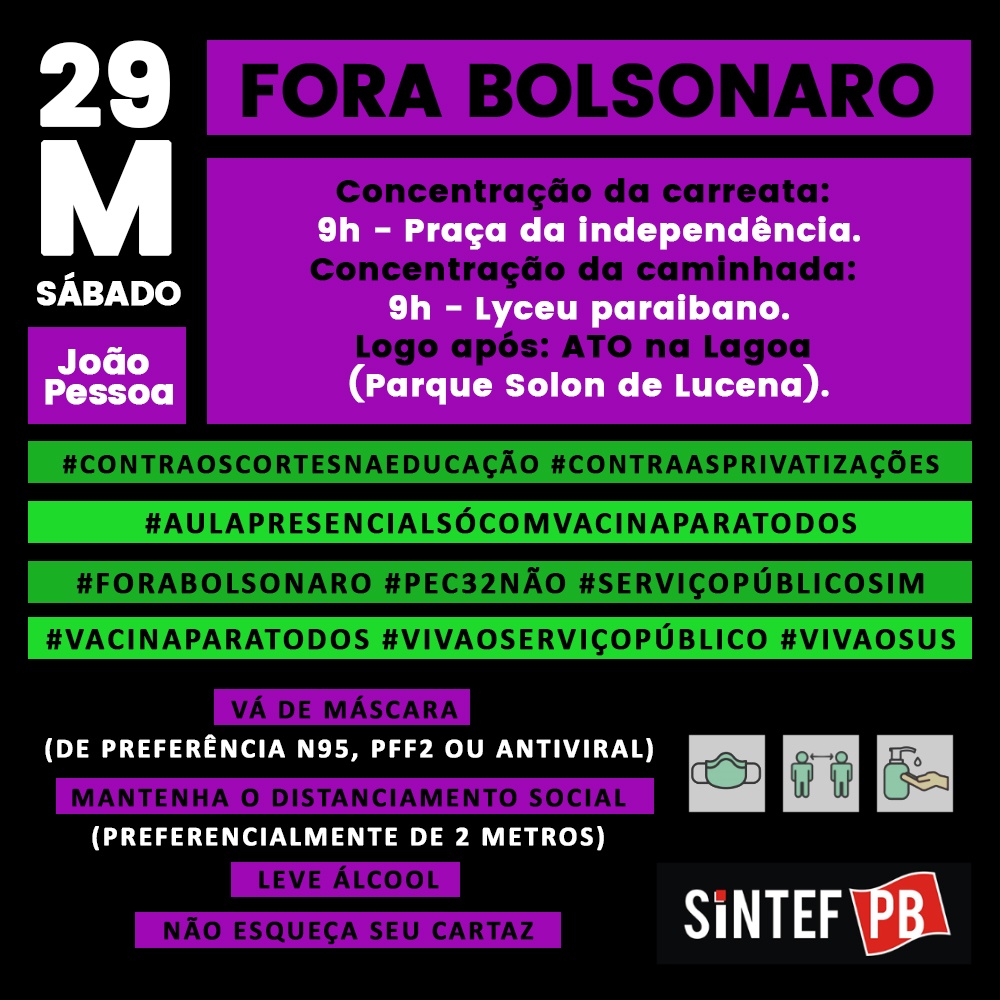 As atividades serão presenciais, nas ruas, e levantarão as bandeiras do “Fora Bolsonaro!” e do “Impeachment, já!”.