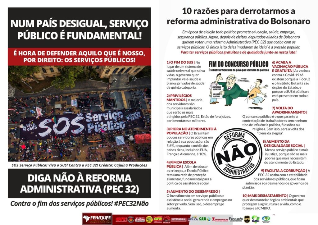 Além de destacar a importância dos serviços públicos diante da desigualdade no país, o material enumera 10 razões para derrotar a PEC da Rachadinha (PEC 32/2020).