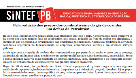 Hoje, 30 de maio, com o início da greve dos petroleiros, foi marcado o DIA NACIONAL DE LUTA E MOBILIZAÇÃO PELA REDUÇÃO DO PREÇO DO GÁS E DO COMBUSTÍVEL, com atos ocorrendo em diversas cidades do país. Em João Pessoa haverá concentração às 14h em frente a Zoonoses, no bairro dos Bancários, com passeata até a