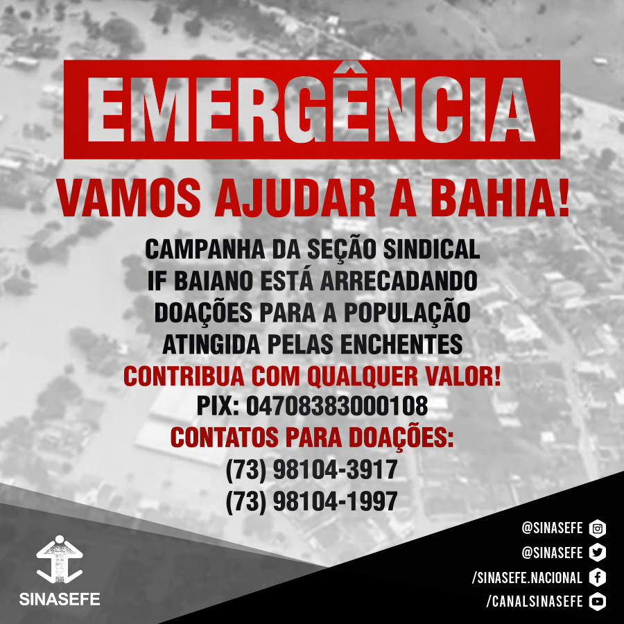 O SINASEFE, atento para a emergência e calamidade pública que assola a população baiana com enchentes e inundações em mais de 100 cidades, divulga a todos a campanha de solidariedade empreendida pelo Sinasefe IF Baiano, que está arrecadando recursos financeiros e materiais para doação aos atingidos. Doações financeiras Doações em dinheiro podem ser