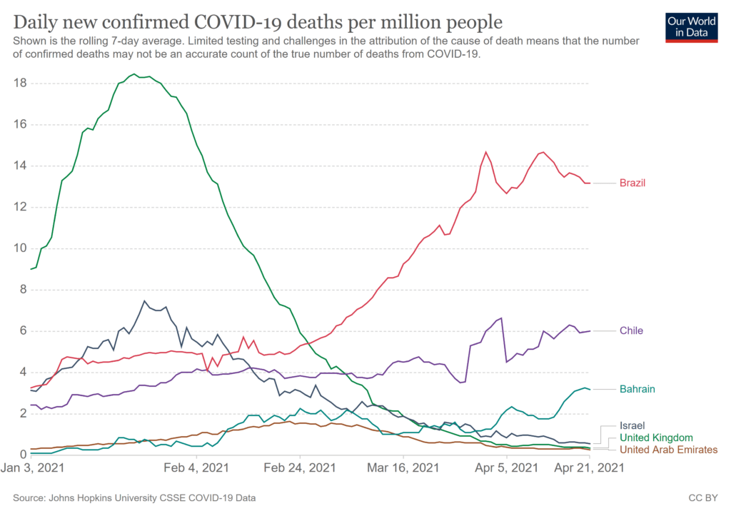 Bahrain, Chile, Israel, Emirados Árabes e Reino Unido estão entre os países que mais vacinaram seus habitantes proporcionalmente. Pesquisadores e cientistas destes locais já divulgaram estudos comprovando a redução brusca de mortes e hospitalizações por COVID-19. Enquanto isso, o Brasil vacinou (com mais de uma dose) apenas 4,3% de sua população e segue registrando milhares de mortes diárias. Mortes por COVID-19 confirmadas