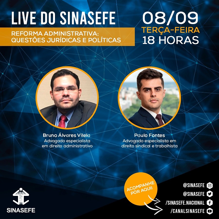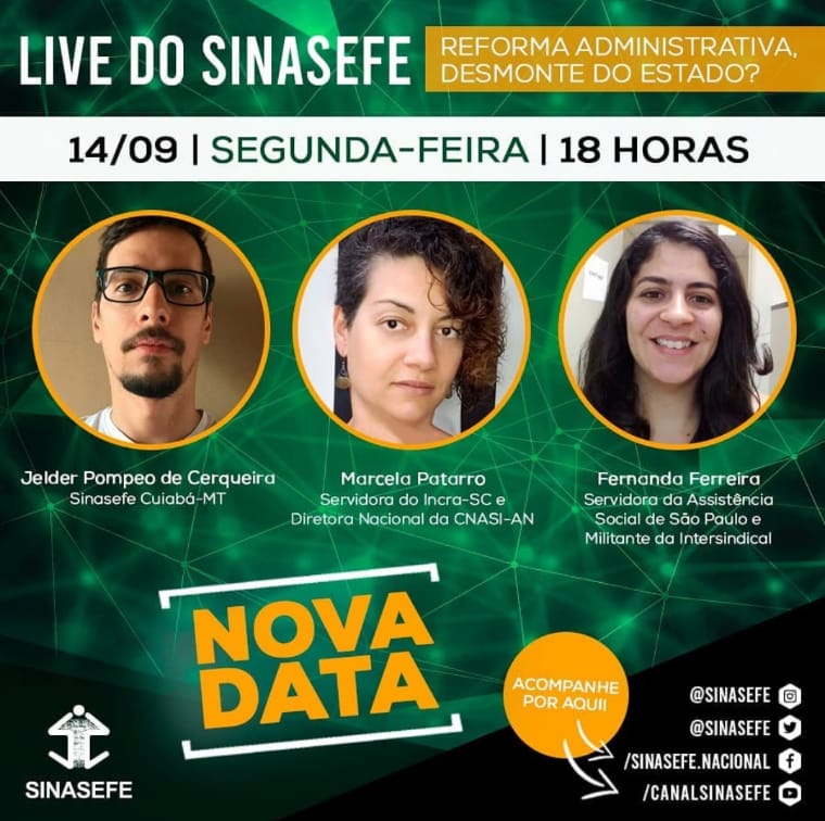 Entre os dias 7 e 11 de setembro, o SINASEFE divulgou cinco transmissões ao vivo. A reforma administrativa, os impactos do ensino remoto no campo e a conjuntura política estiveram em pauta. Um seminário virtual da Jornada Unitária em Defesa dos Serviços Públicos, pautando mitos e verdades sobre servidores e serviços públicos, também foi ao ar.