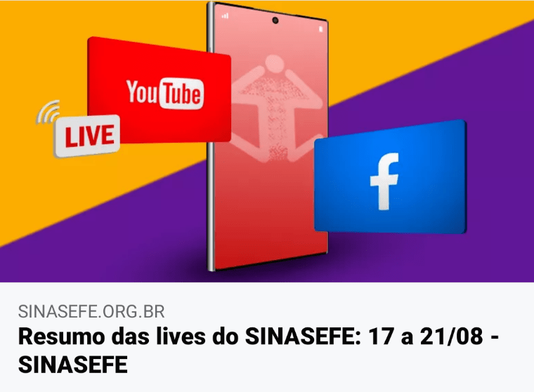🎥 Retrospectiva das Lives do SINASEFE (da semana passada). O SINASEFE realizou 5 lives entre os dias 17 e 21 de agosto. A tecnologia e a realidade das favelas na pandemia estiveram em pauta durante as transmissões, além da mobilização para a greve contra o ensino remoto e o assédio moral. Apoiada pelo
