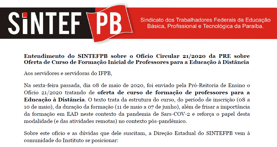 O SINASEFE realizará nesta quarta-feira (13/05), a partir das 18 horas, a sua 32ª transmissão ao vivo (live) desse período de isolamento social. A exibição acontecerá simultaneamente na fanpage do Facebook e no canal do YouTube do sindicato. A transmissão terá como tema “O papel da Rede Federal de Educação na contemporaneidade”, contando com as participações de Carlos Magno (coordenador geral do SINASEFE), David