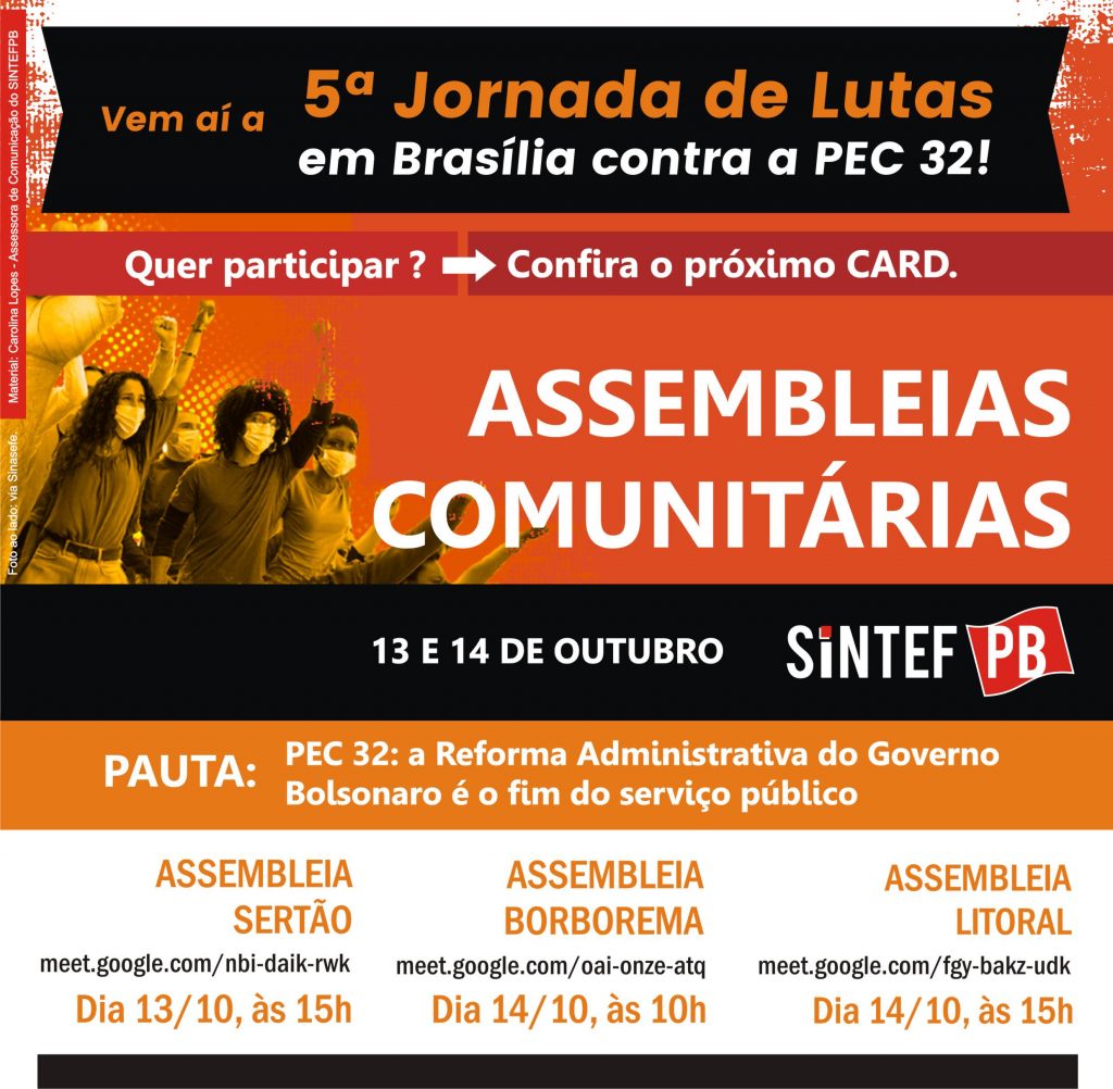 LINKS DAS NOSSAS ASSEMBLEIAS ASSEMBLEIA COMUNITÁRIA SERTÃO: meet.google.com/nbi-daik-rwk ASSEMBLEIA COMUNITÁRIA BORBOREMA: meet.google.com/oai-onze-atq ASSEMBLEIA COMUNITÁRIA LITORAL: meet.google.com/fgy-bakz-udk ⚠️⚠️⚠️⚠️⚠️⚠️⚠️⚠️⚠️⚠️⚠️⚠️ O SINASEFE NACIONAL continuará sua luta contra a Reforma Administrativa (PEC 32/2020) com a 5ª Jornada de Lutas em Brasília-DF que acontecerá de 18 a 21 de outubro e será decisiva para derrotar de vez … Continue lendo Jornada de lutas em Brasília (18 a 21 de outubro) e rodada de assembleias comunitárias (13 e 14 de outubro)