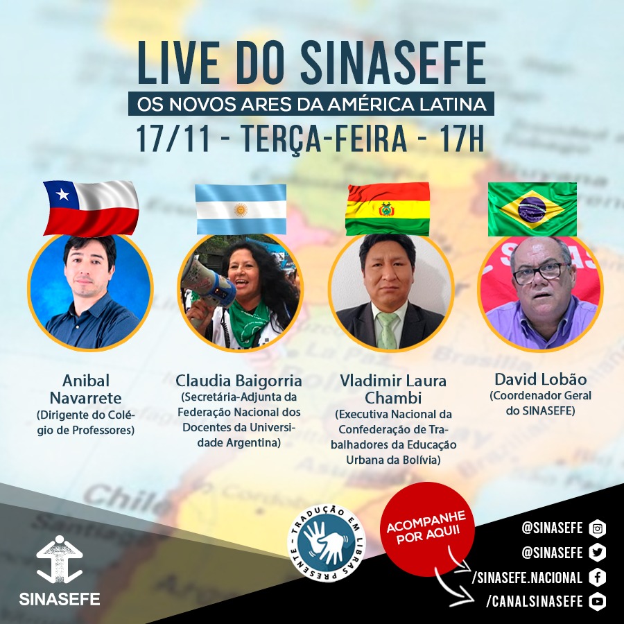 A transmissão AO VIVO terá como tema “Os novos ares da América Latina” e contará com as participações de David Lobão (Coordenador Geral do SINASEFE), do chileno Anibal Navarrete (Dirigente do Colégio de Professores), da argentina Claudia Baigorria (Secretária-Adjunta da Federação Nacional dos Docentes da Universidade Argentina) e do boliviano Vladimir Laura Chambi (Executivo Nacional da Confederação de Trabalhadores da Educação Urbana da Bolívia).