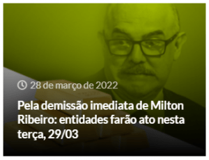 Nesta terça-feira (29/03) às 11h, entidades estudantis e sindicais se encontrarão às portas do MEC, em Brasília-DF. Objetivo será exigir a demissão imediata do ministro da Educação Milton Ribeiro, além de cobrar a investigação do esquema de corrupção em que Ribeiro está envolvido, o chamado “Bolsolão”. SINASEFE, Andes-SN, Fasubra, UNE e Ubes convocaram juntas … Continue lendo Atualizado: MILTON RIBEIRO É EXONERADO | Pela demissão imediata de Milton Ribeiro: entidades farão ato nesta terça, 29/03