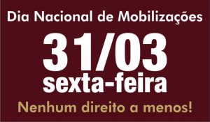 Matéria retirada na íntegra do site do SINASEFE NACIONAL . O SINASEFE convoca toda categoria para se mobilizar na próxima sexta-feira (31/03). A Direção Nacional aprovou este chamado em sua 5ª reunião, realizada nos dias 25 e 26 de março em Brasília-DF. A mobilização, chamada por diversas frentes e entidades na última semana, tem o … Continue lendo SINASEFE convoca todos(as) para as mobilizações em 31/03 e destaca importância da Greve Geral. Confira.